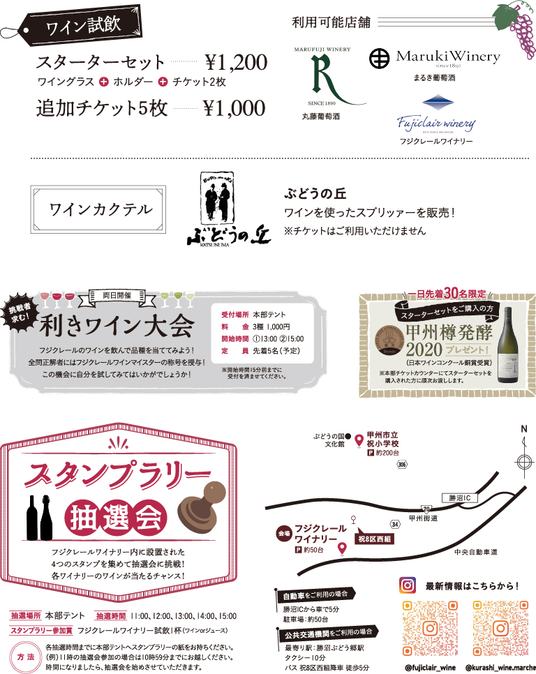 ワインは日常に彩を加えてくれる飲み物。同じように日常を豊かにするモノは私たちの生活に数多く存在します。今回はおいしいマルシェ!食べて飲んで買い物して!皆様の生活を彩るイベントになりますように。
