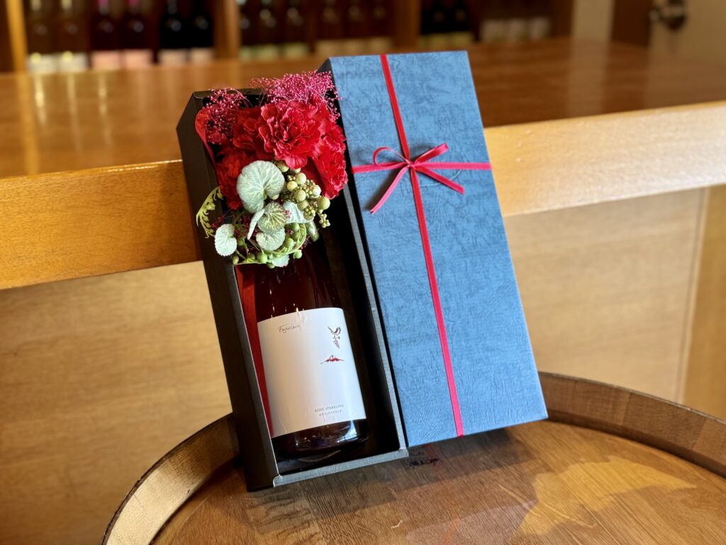 目にも鮮やかなフジクレールのロゼスパークリングをカーネーションのアレンジメントでデコレーションしました。瓶内二次発酵による本格的な味わいと、イチゴなどの赤系果実のアロマをお楽しみいただける1本です。