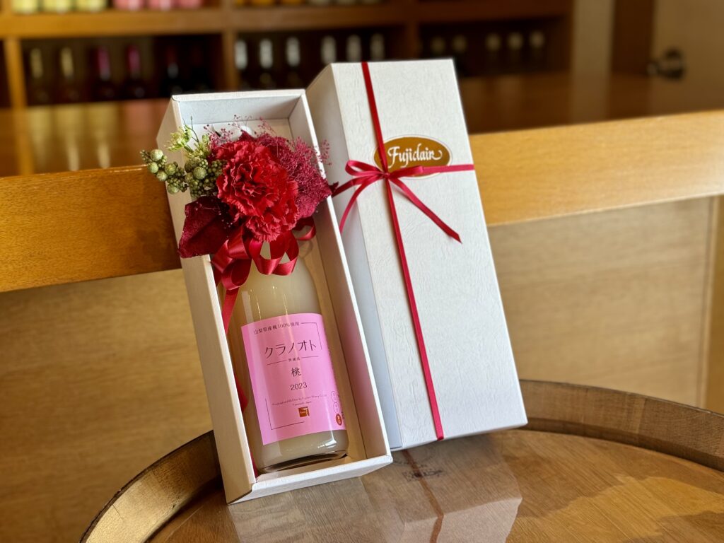 弊社の大人気商品「クラノオト桃」をカーネーションのアレンジメントでデコレーションしました。白桃のフレッシュな香りと濃厚な味わいをダイレクトに堪能できる1本です。アルコール数5%と低アルコールで、食前酒やデザートワインとしてもお召し上がりいただけます。