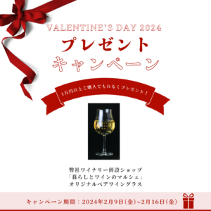 お会計金額1万円(税込)以上ご購入いただいたお客様に、当ショップの「オリジナルペアワイングラス」をもれなくプレゼント!バレンタインの乾杯シーンに、是非ご活用ください。 キャンペーン対象:お会計金額1万円(税込)以上ご購入いただいたお客様プレゼント内容:暮らしとワインのマルシェ オリジナルペアワイング […]